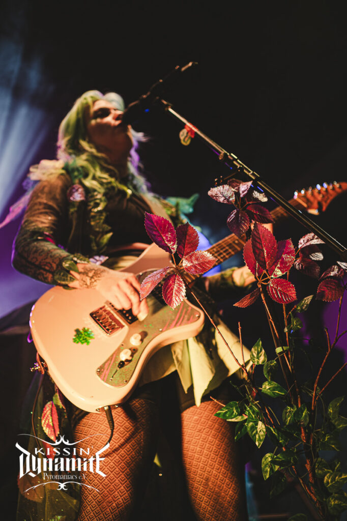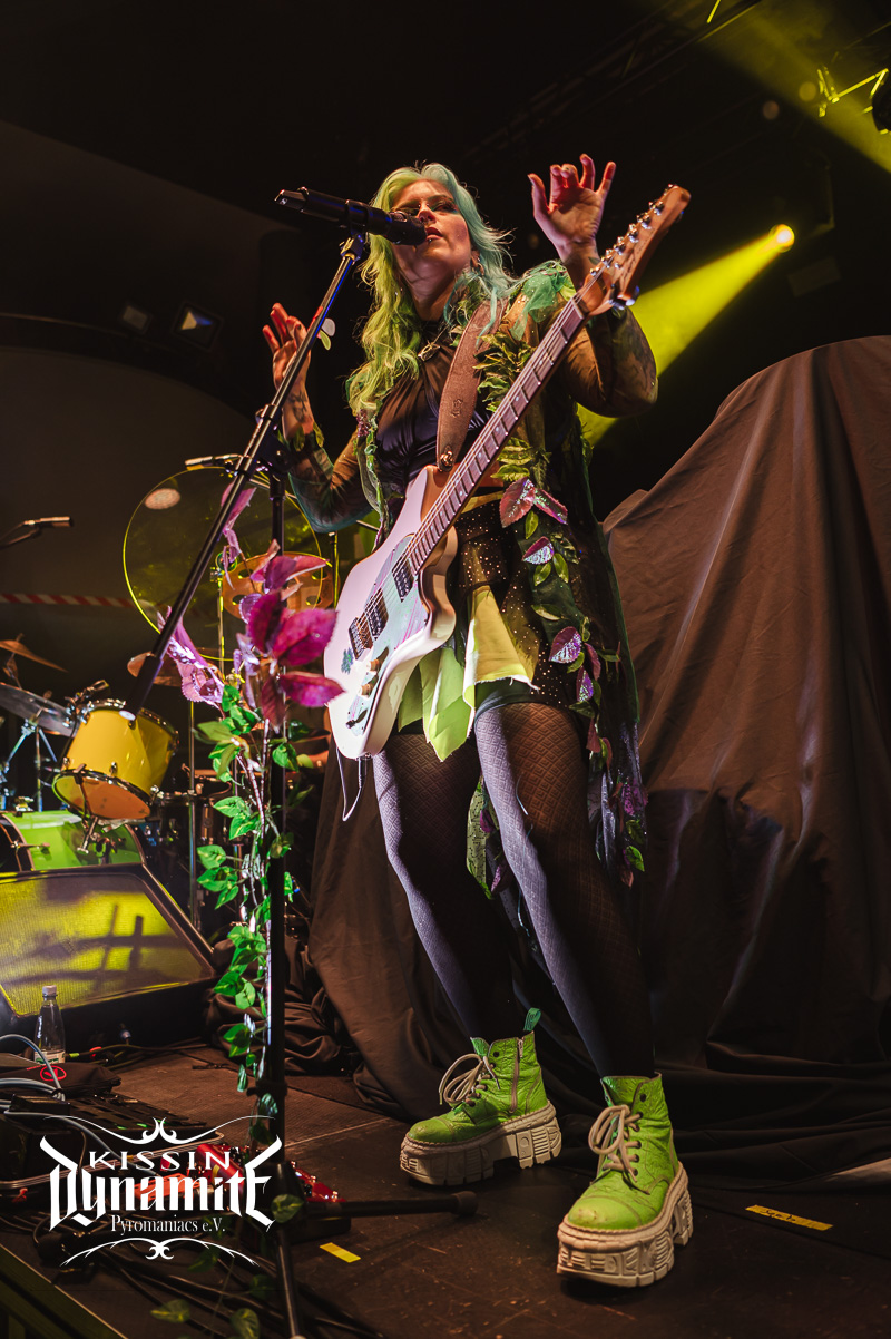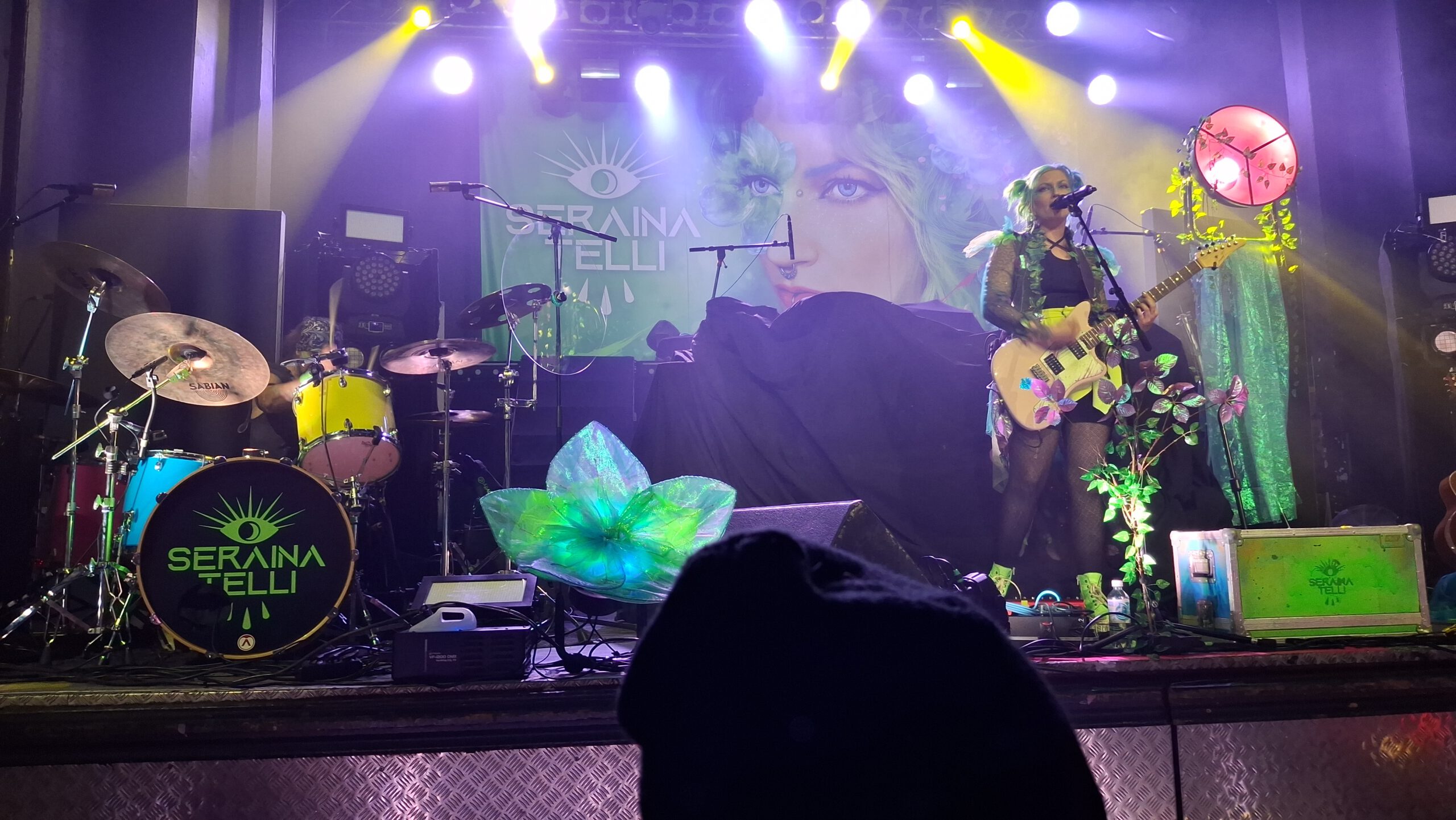 An der Stelle nochmal tausend Dank an Sebastian. 🤘🏻🖤 Drinnen angekommen wurde unser Pyromaniacs-Stand aufgebaut und fleißig Flyer verteilt. Währenddessen ging es für uns Andere ab in die erste Reihe. 😁. Die erste Vorband des Abends fing auch kurz darauf schon an: Seraina Telli🌿.Ihre Bühnenkulisse war wunderschön und sehr blumig genauso wie ihr Outfit. Die Stimme von ihr ist einzigartig und sie besitzt sehr viel Talent..😅
