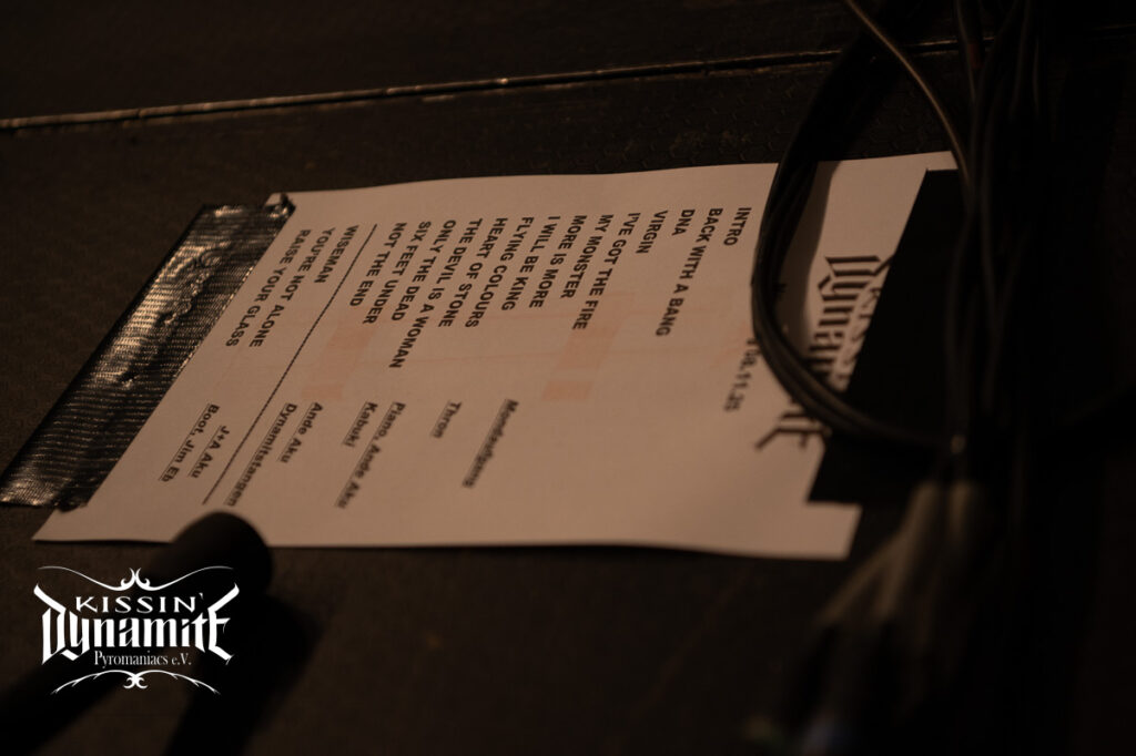 Mit ein paar anderen Vereinsmitgliedern ging es durch die Fastlane früher in den Club „Tante Ju“. Am Merch der Vorband konnte ich eine alte Bekannte aus unserem Verein wieder treffen. Und sogar ein paar kurze Blicke auf Hannes und Jim erhaschen, die noch in den Vorbereitungen steckten. Die Pyromaniacs verteilten sich mittig vorn und präsentierten die Vereinsflagge über der Absperrung. Der ausverkaufte Club füllte sich.