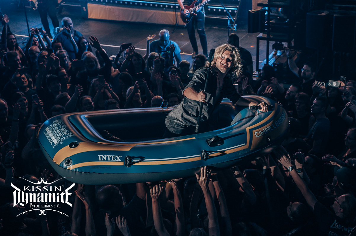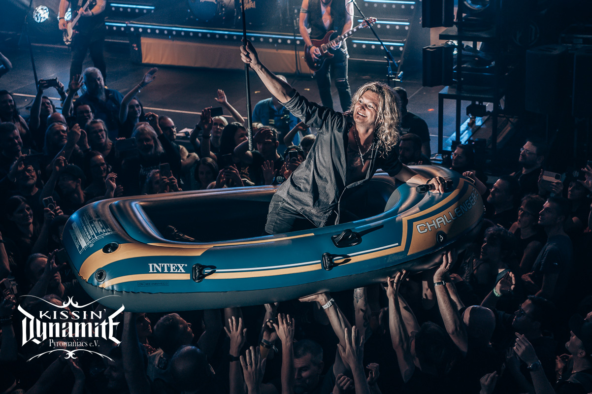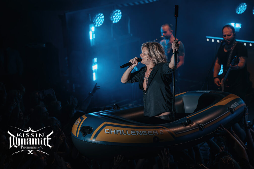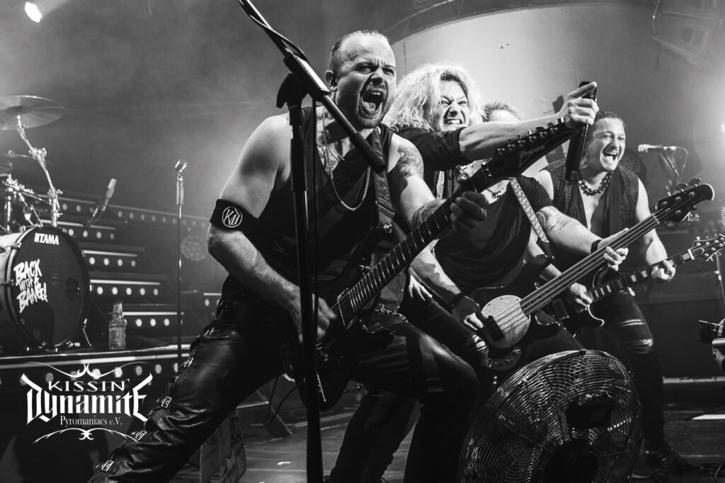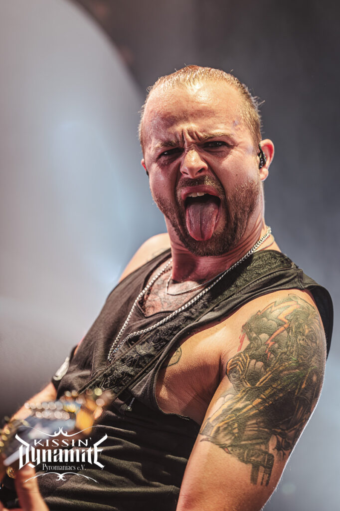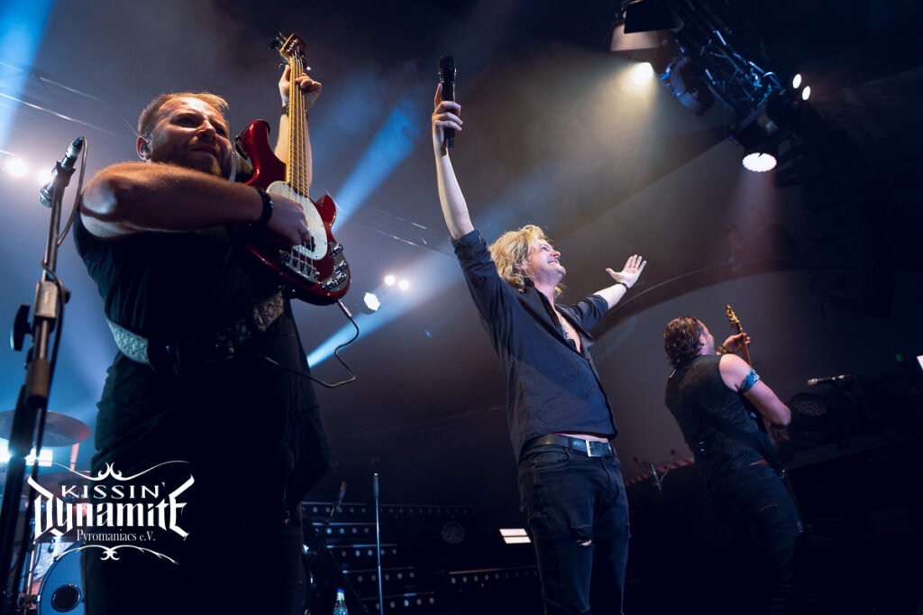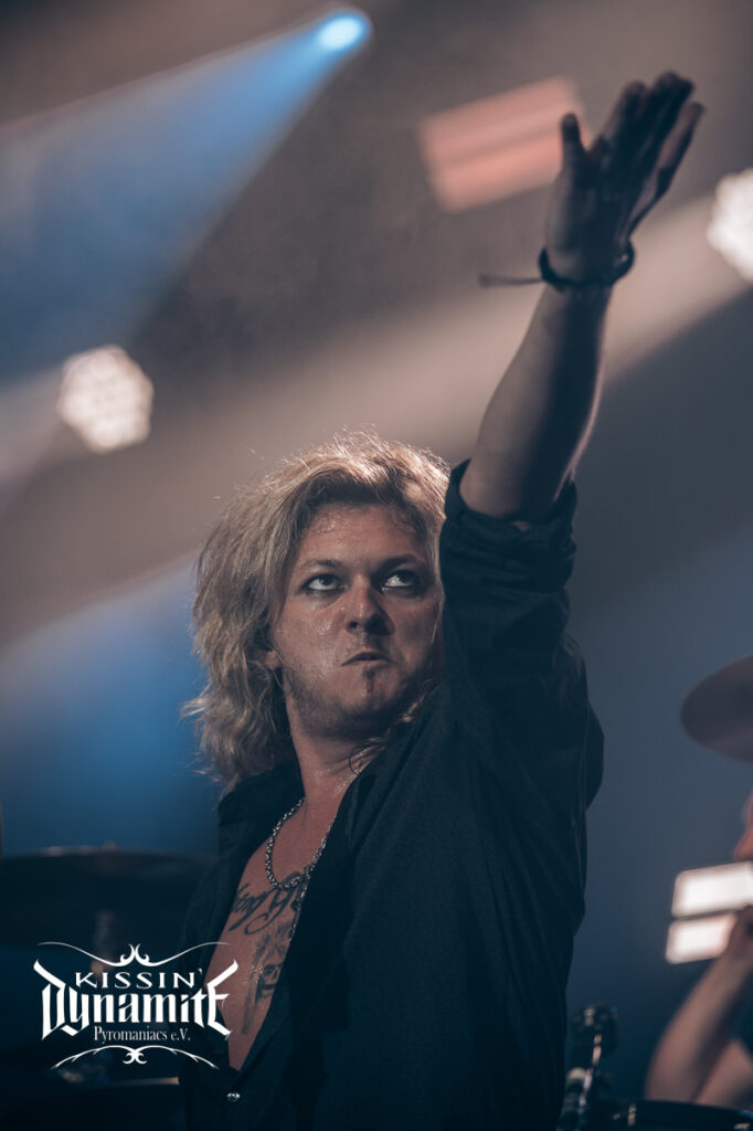 Nun ist es an der Zeit für den Headliner, Kissin´ Dynamite. Die Banger sind back mit Tour Nummer zwei zum aktuellen Album. Neben mir steht ein sehr aktives Fangirl, welches die gesamte Zeit über durch Kreischen, Rufen und Hände ausstrecken versucht, auf sich aufmerksam zu machen. Dadurch komme ich mir nun eher vor, wie auf einem Konzert einer 90´s-Boyband.